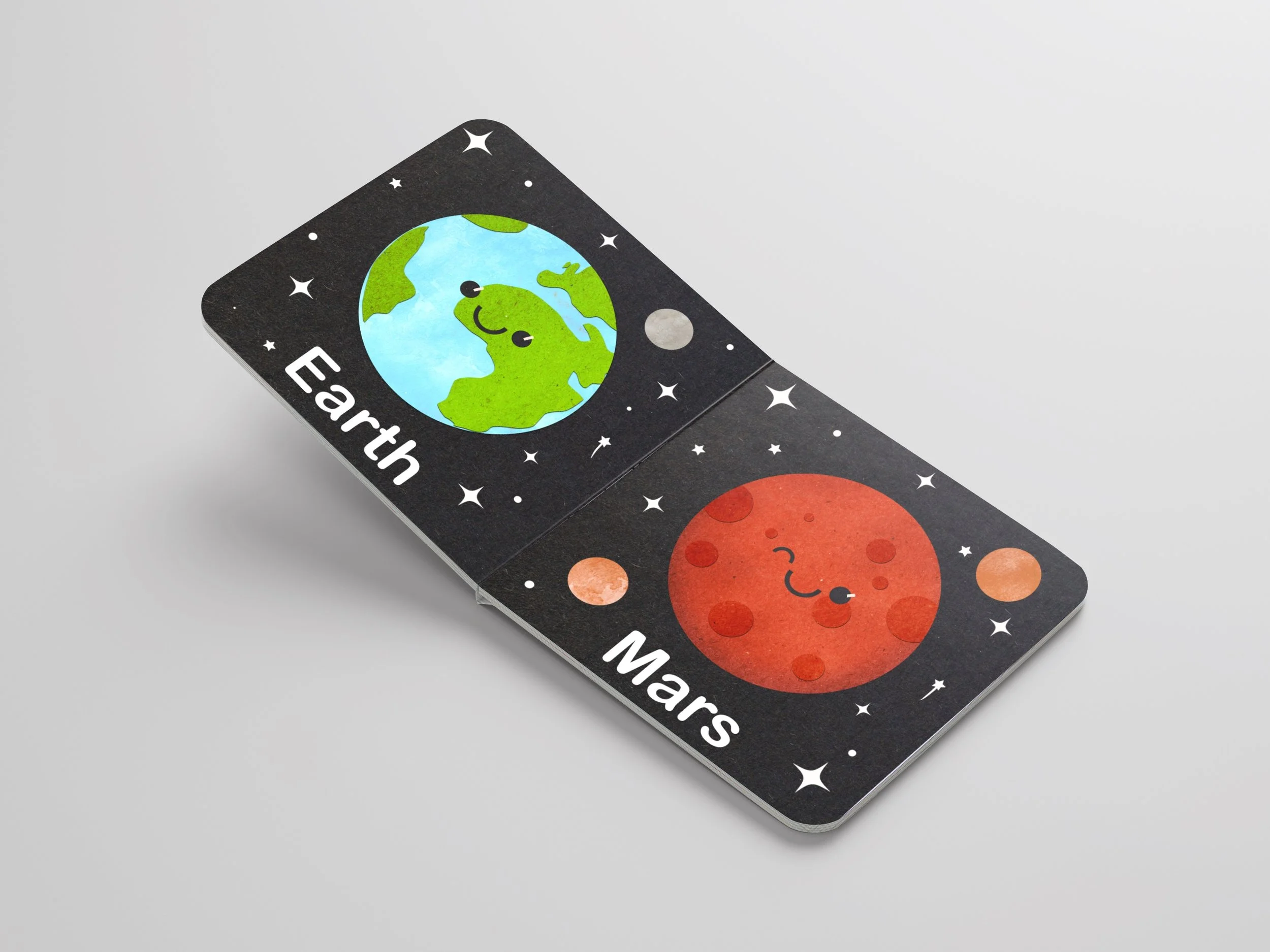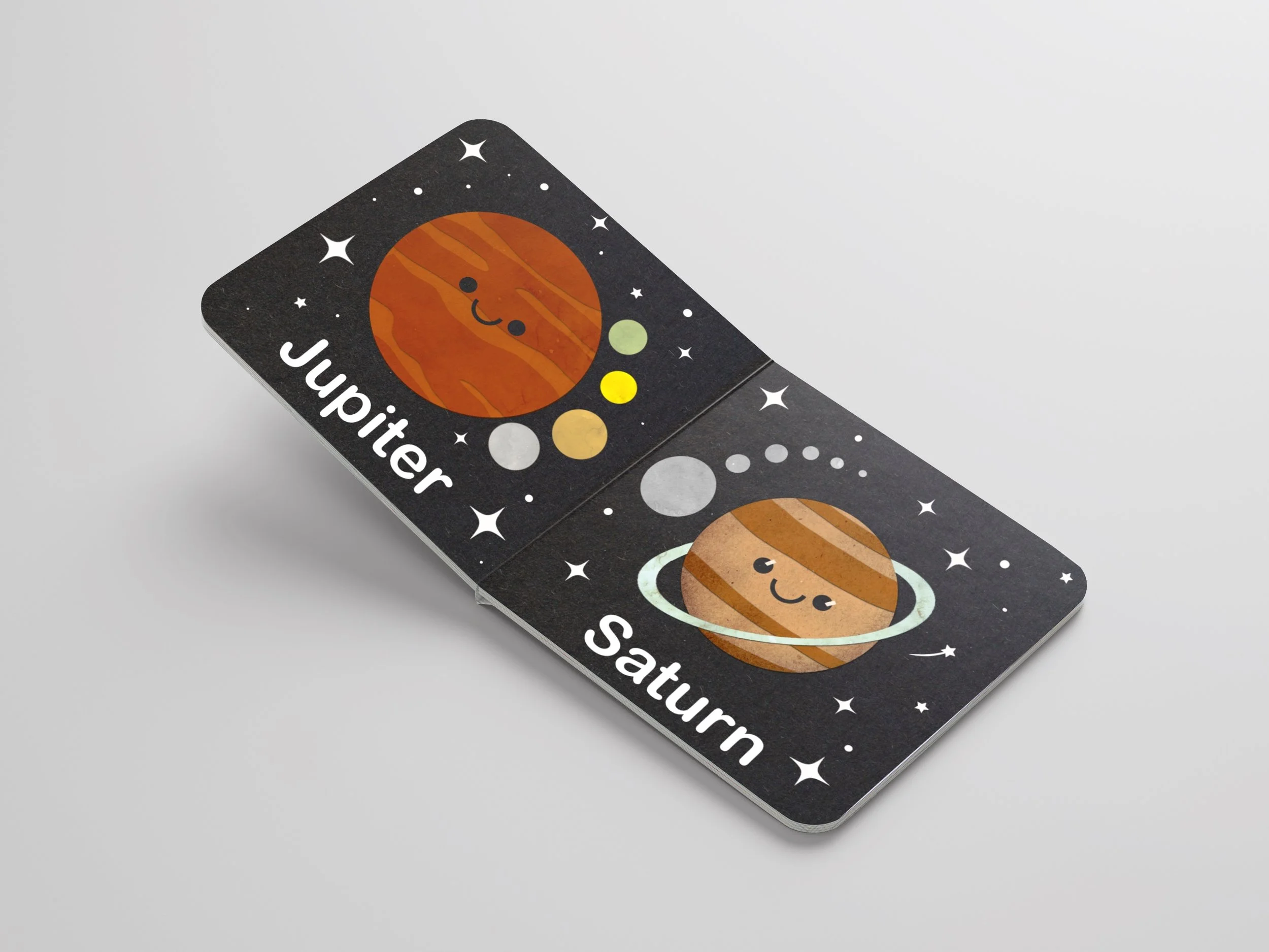This project is a planet-themed board book illustrated in a unique papercut style. Each page layers textures, shapes, and colors to create depth and a tactile, handcrafted feel. Designed for curious little minds, the illustrations introduce planets and space in a way that is both educational and visually captivating. The papercut aesthetic adds a playful, artistic touch, making learning about the universe exciting and magical.